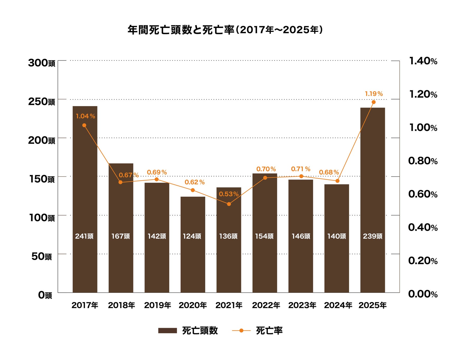 年間死亡事故数は239頭(昨年比+99頭)*1、死亡率として1.19%(昨年比+0.51%)*1でした。