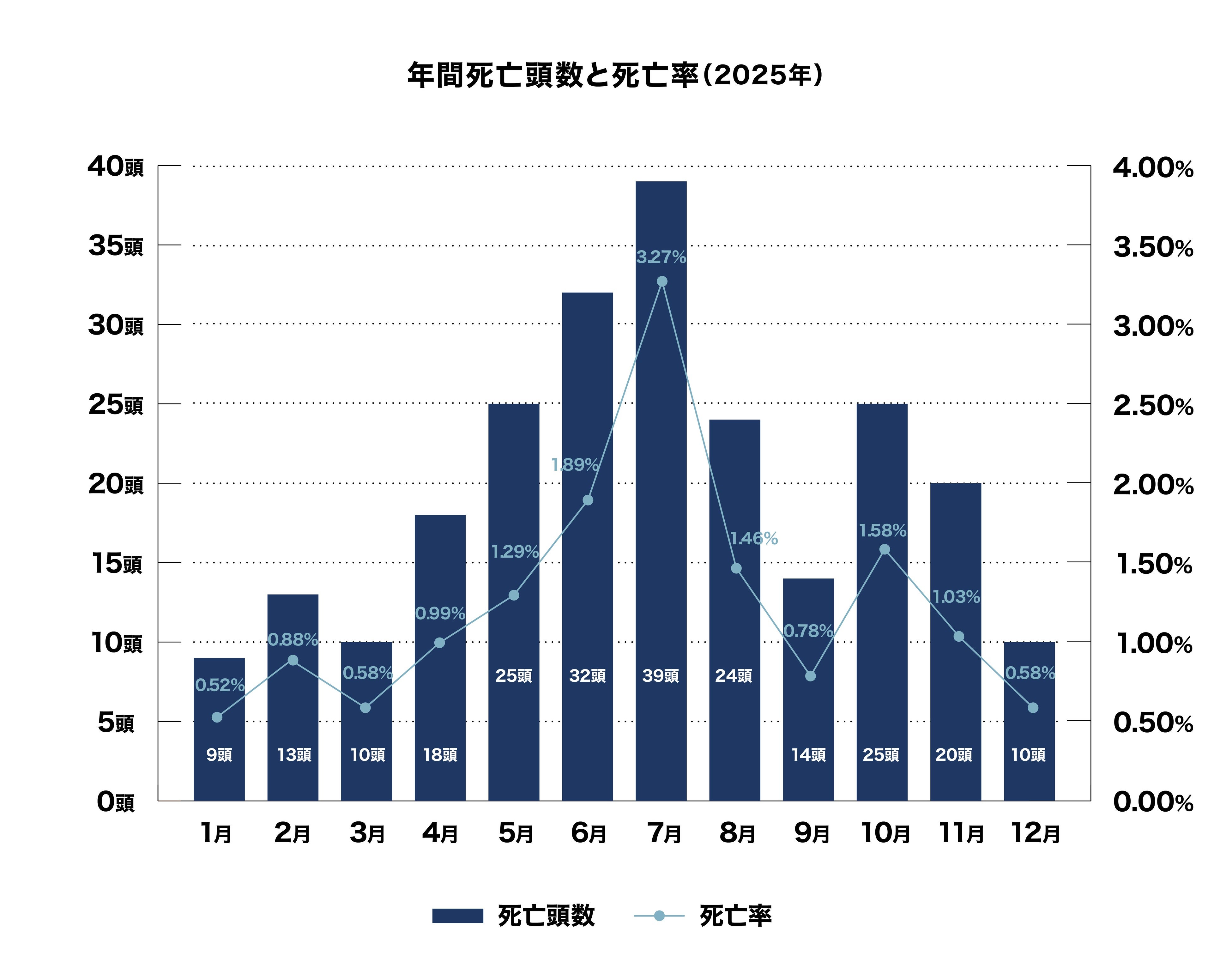 2025年の月別の死亡率推移は以下のようになっており、6~7月において死亡頭数および死亡率の増加が認められましたが、その後、下降傾向を辿っています。