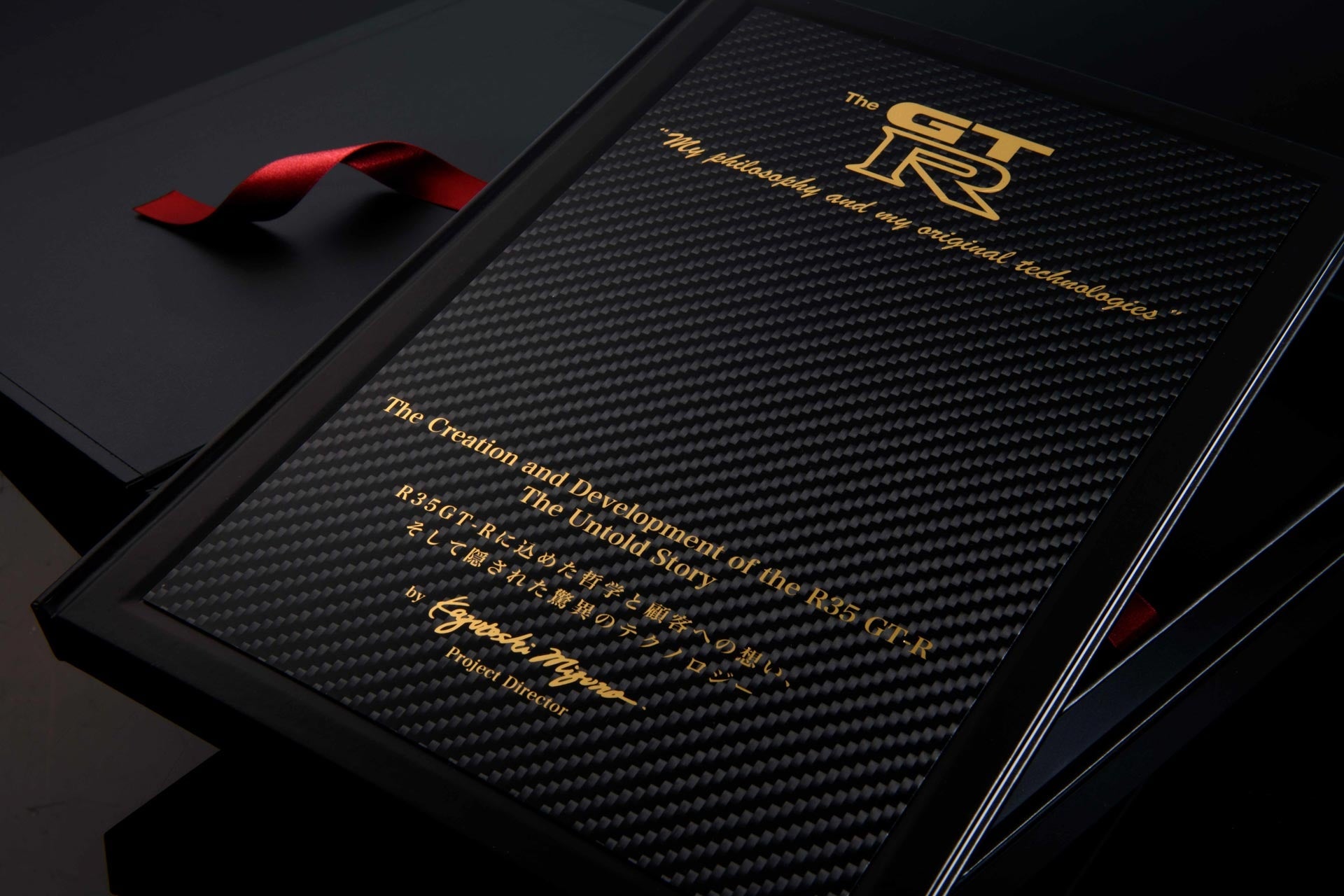 未公開の内容と貴重な写真を収録するにあたり、水野氏がこの書籍でこだわったのが「R35GT-R =クルマとの一体感」と本物だけが持つ上質感、そして時の経過と共に上がるヴィンテージな価値です。こうしたことから、表紙と背表紙には実際に、2013年モデルまで、センターコンソールに採用されていた部品と同じカーボン製のパネル(写真上)を採用しました。製作も、実際にR35GT-Rのカーボン製部品のほぼ全てを手がける(株)チャレンヂで、同社の本社工場にあるR35GT-Rと同じ製造設備と工法を使って製造されます。仕上げは、R35GT-Rのカーボン製リヤウィングと同じ「艶消し黒色含有のクリア膜厚50~60ミクロン塗装」のカーボン製パネルに、書籍タイトルをゴールドで箔押し。水野氏がR35GT-Rの開発でもこだわった、マットで立体感のある上質さを再現しています。