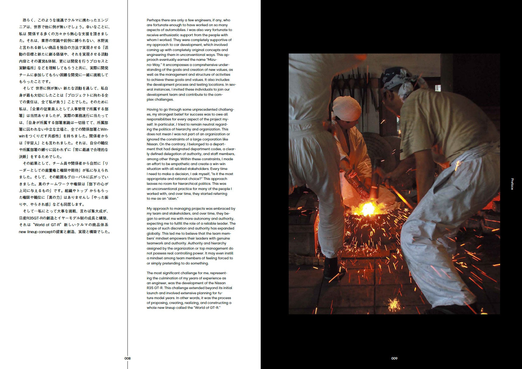 2013年まで、R35GT-Rのプロジェクト責任者としてグローバルなマネージメント統括を行うと共に、持てる全ての思考と独自のテクノロジーを注ぎ込み、プレーイング・マネージャーとして”マルチ・パフォーマンス・スーパーカー”、新たなスーパーカーのジャンルを創造し育てた、開発責任者の水野和敏氏
