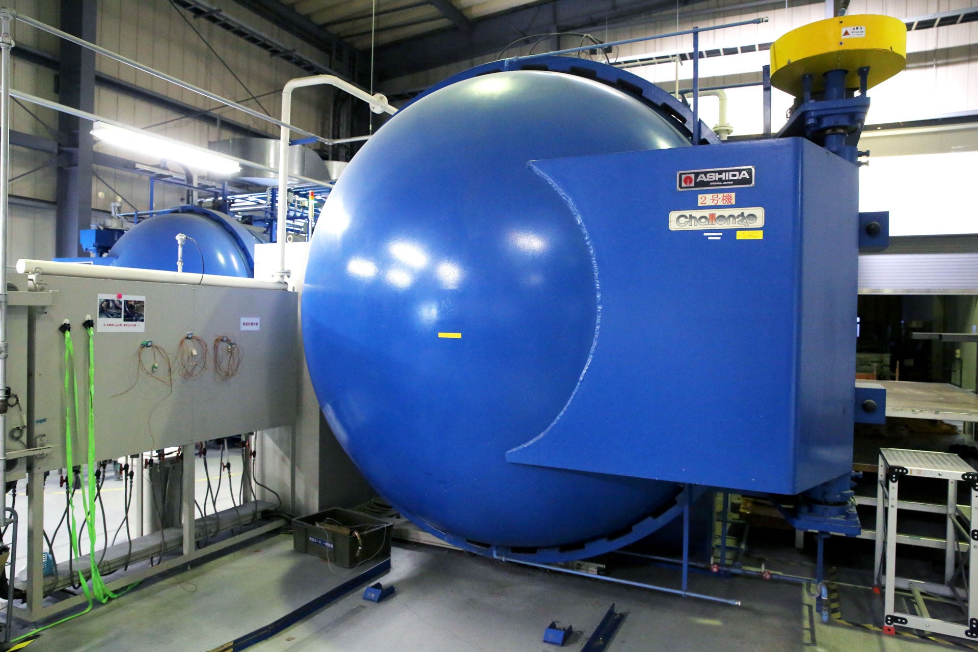 書籍の表紙を飾る ドライ・カーボン製パネルは、(株)チャレンヂ本社工場のオートクレーブ釜を使って、