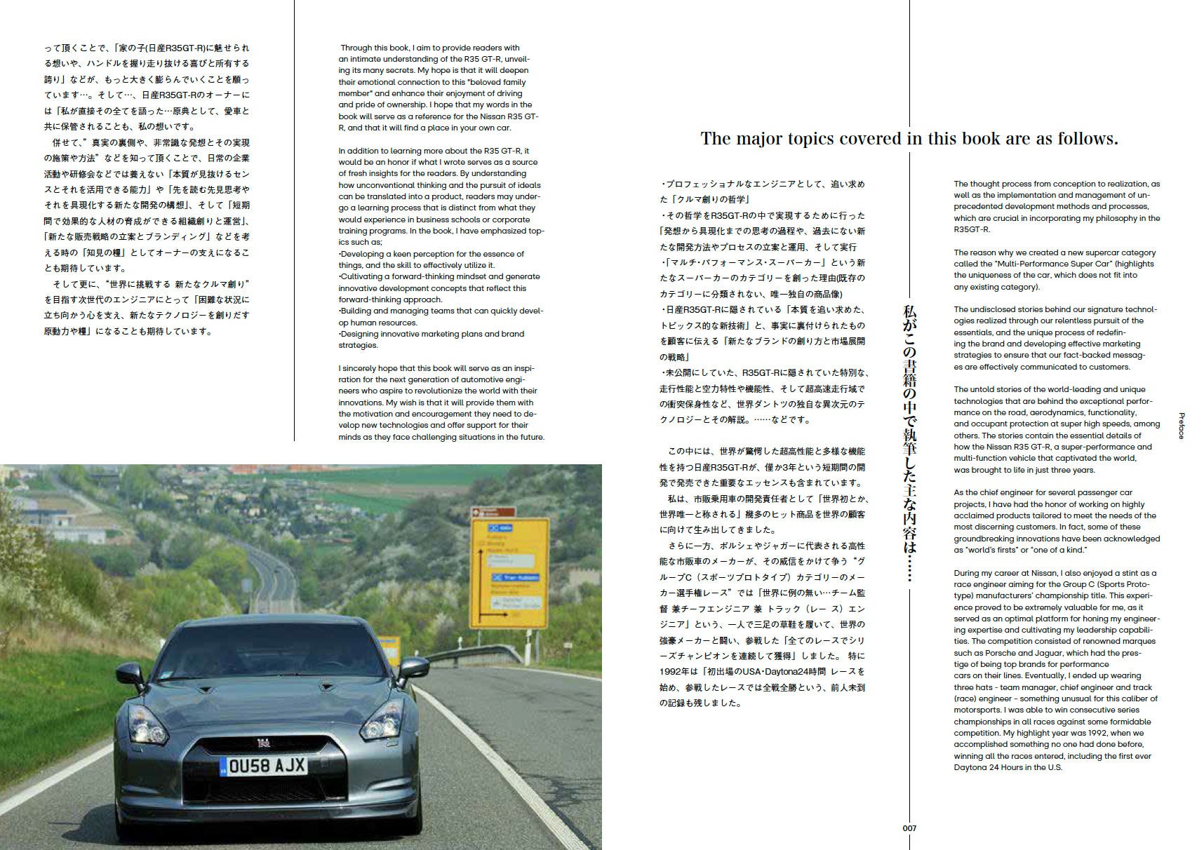 「発表発売後15年を経た日産R35GT-Rも生産終了の時期が近づいており、各イヤーモデルも発売後には即完売状態です。こうした状況になった今だから、今まで公表せずに、私の内に留めていた『クルマ創りの哲学や商品への執念。超短期間の内に世界最高の超高性能なスーパーカーを開発すると共に、世界ブランドとして市場に定着させたシナリオ。R35GT-Rに隠されているユニークな世界超ド級の独自テクノロジーと、織り込んだ特殊な性能や機能と信頼性』などを、自身で直筆して、R35GT-Rを愛好されるオーナーやファンに向けて、正しい内容を語り説きたいと想っています」