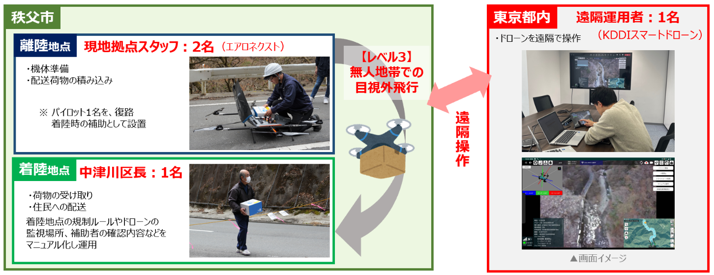 3月2日(木)の配送より、目視内での自動飛行で行う「レベル2」から、無人地帯での目視外飛行を行う「レベル3」での配送に移行しました。さらに、着陸地点に技術者を配置せず、東京都内から遠隔操作を実施。荷物の受け取りを中津川区長1名で対応しました。