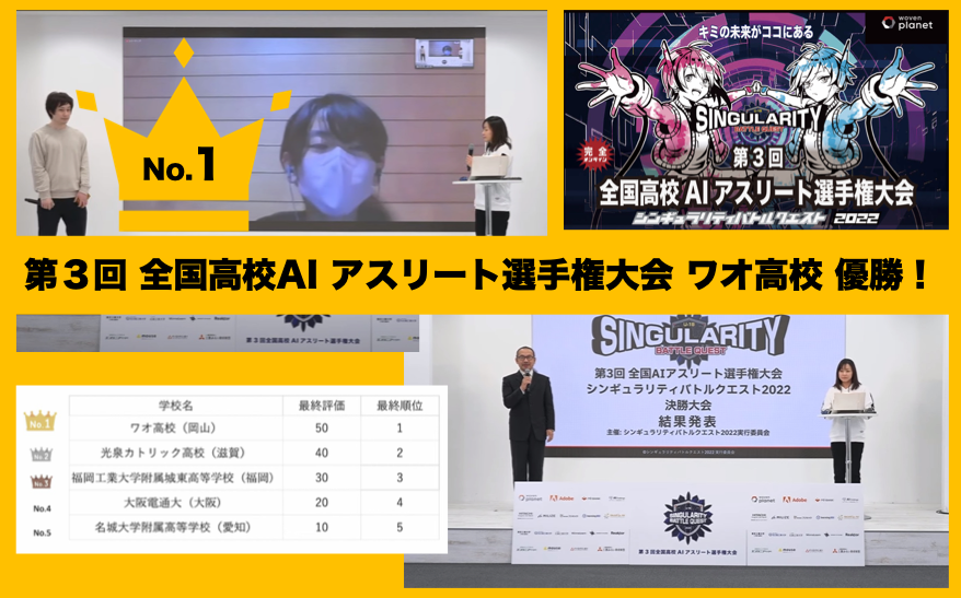 AIコースでデータサイエンスを学ぶ生徒が出場し、データクエスト競技で優勝。その他競技でも上位入賞を果たし、ワオ高校の学びの実践力の高さが証明されました。