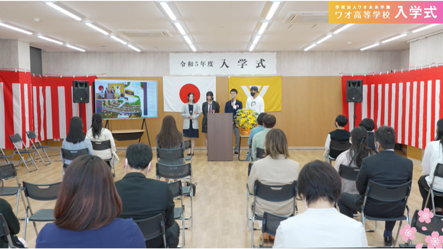 開学から3年、いよいよ3学年がそろいました。令和5年度の入学式は、岡山本校と東京、バーチャルキャンパスで行うハイブリッド型。生徒が司会役を務めるワオ高らしさあふれる式典となりました。