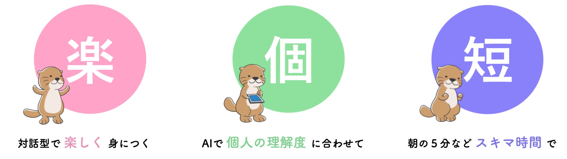 タイピング練習を通じて、学習の基盤となる能力として重要なタイピングスキルを楽しみながら 身につけることができます。教科と連携した練習コンテンツで、子どもたちは学習しながらタイピングスキルを伸ばすことを目的としています。また、独自のAIシステムで各個人の間違えやすい問題の再出題や学習状況の記録ができます。