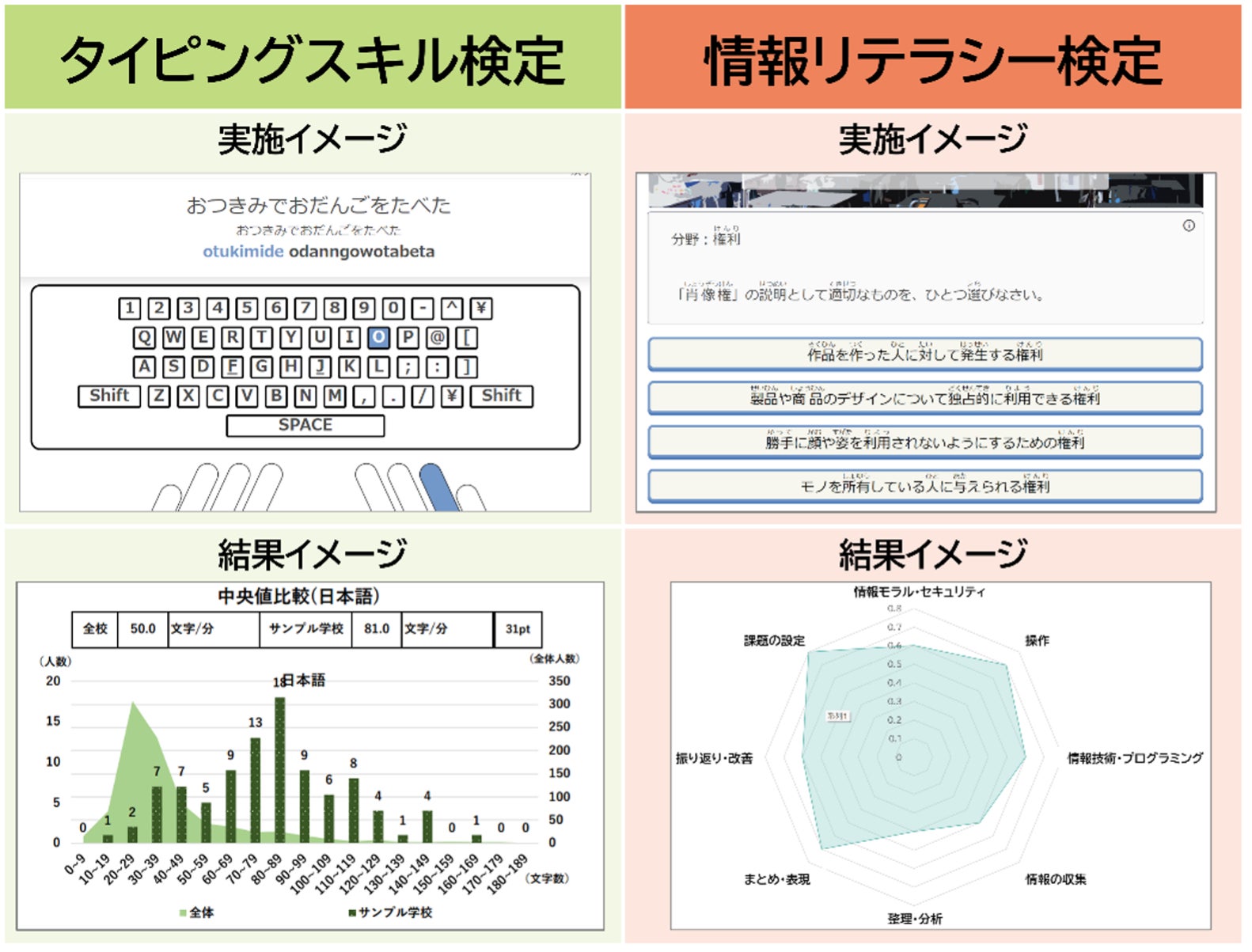 本検定は、自治体・学校単位で子どもたちのタイピングスキルと情報活用能力の習熟度を可視化することで、より活発な端末活用に必要なスキルの習得を促すことを目的としています。検定を受けたその場で、自治体・学校・受検した児童生徒それぞれがグラフ化されたデータを確認することができ、詳細データを後日、自治体・学校へレポート形式でフィードバックします。