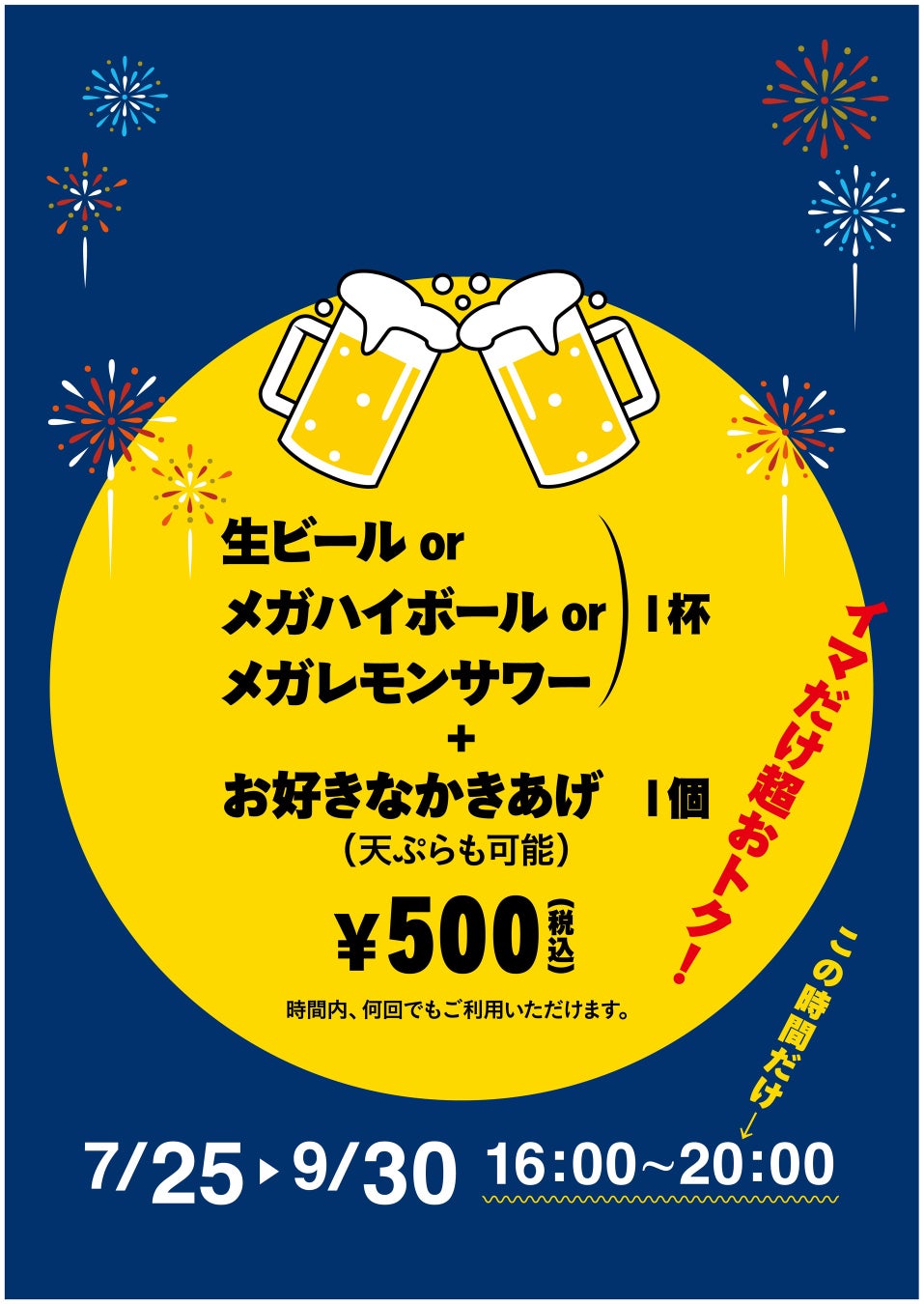 生ビールorメガハイボールorメガレモンサワー+お好きなかきあげを、500円(税込)でご注文いただけます。