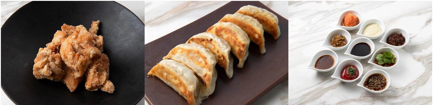 中でもおすすめは、”ソースと楽しむ”シリーズとして展開するシェフ自慢の国産若鶏唐揚げや肉汁たっぷりの餃子です。注文を受けてから作る唐揚げや餃子は、そのままでも美味しいですが、今回はバラエティに富んだ9種類のソースをご用意。ジューシーな唐揚げや餃子を各種ソースにディップすれば、お客さまにとって最高の組み合わせがきっと見つかります。
