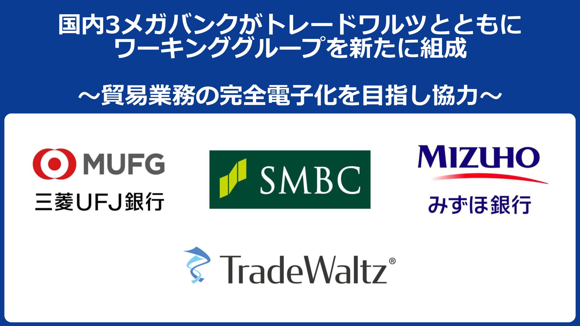 このような課題を解決するため、国内3メガバンク(株式会社三菱UFJ銀行、株式会社三井住友銀行、株式会社みずほ銀行)、およびトレードワルツは、新たに金融ワーキンググループを組成し、貿易決済プロセスの完全電子化を目指して協力することを決定しました。