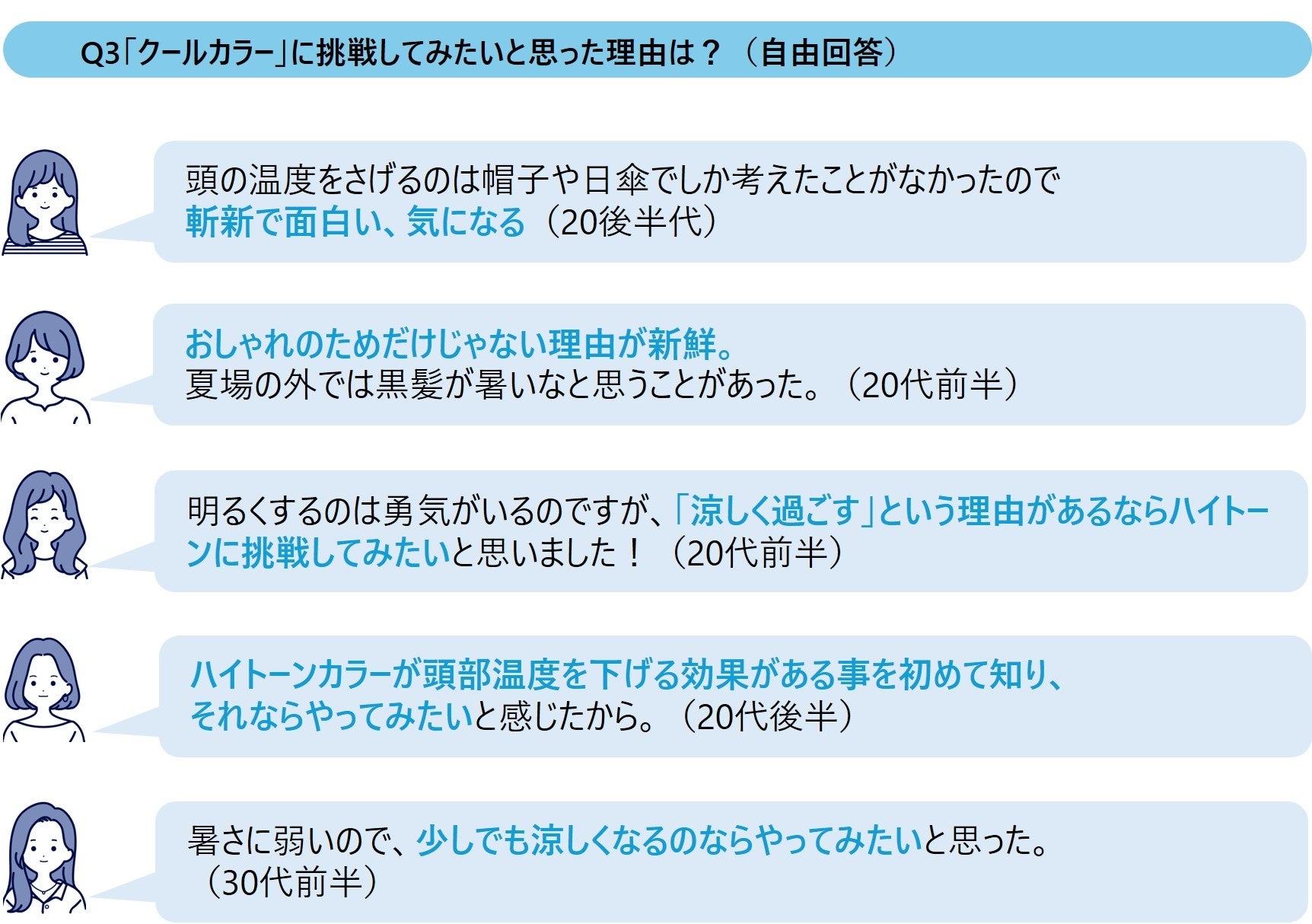 また、挑戦してみたい理由としては、従来とは異なる“暑さ対策”という切り口に対し、「斬新で面白い」「初めて知った」といった驚きの声が多く見られました。さらに、「暑さ対策になるなら納得できる」といった声もあり、ハイトーンカラーにハードルを感じていた層にとっても、挑戦するきっかけとして受け入れられやすい傾向が見られました。