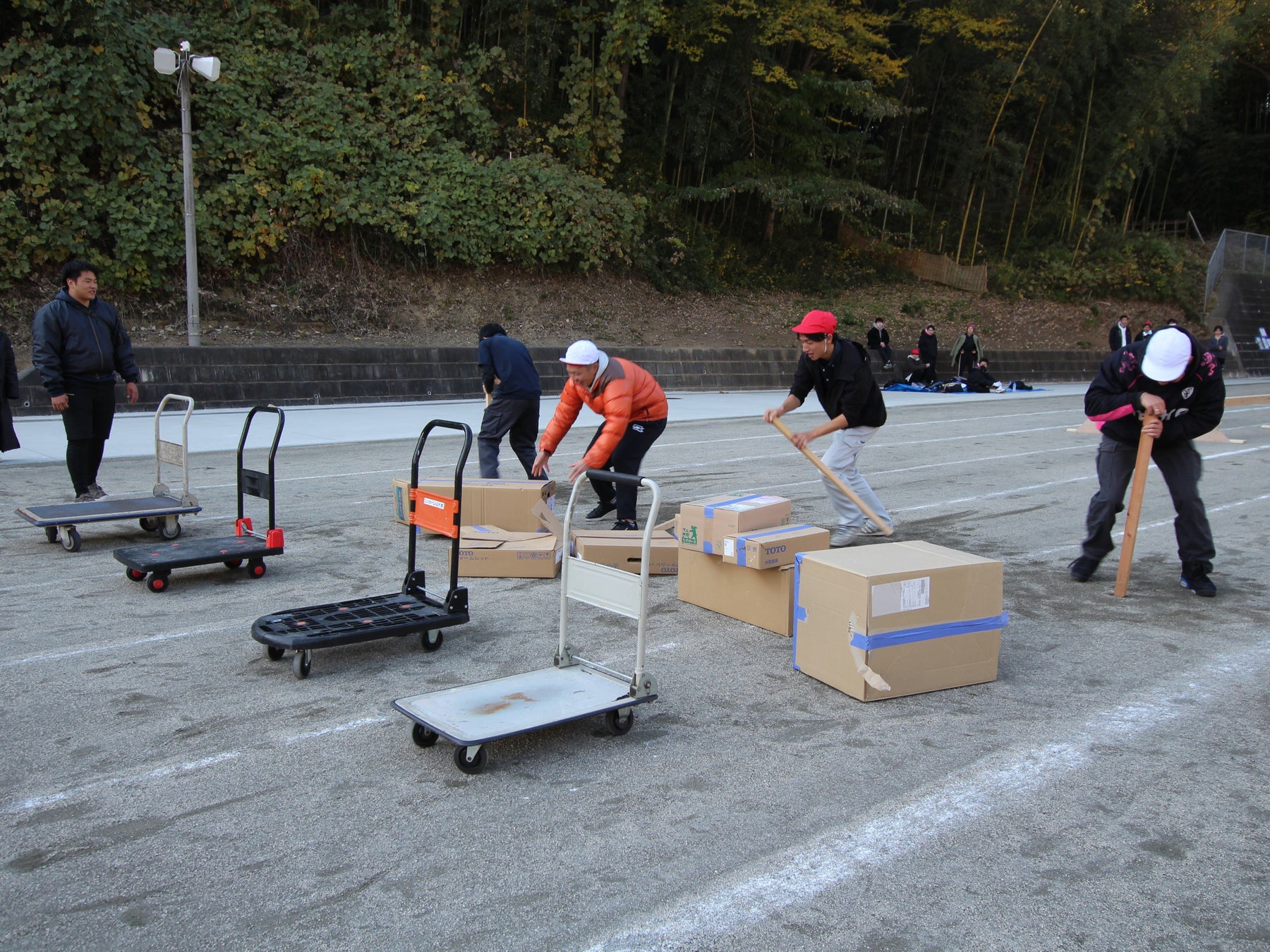 ・第二関門:グルグルバット台車運び・・・バットの代わりの角材で10周まわり、台車でダンボールを積んで運搬