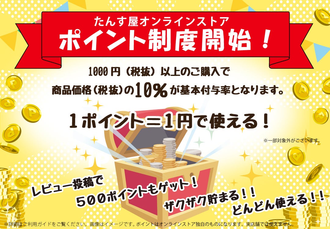 たんす屋オンラインストアでのご購入金額(税抜)が1,000円以上の場合に、ご購入金額(税抜)の10%を基本付与致します。