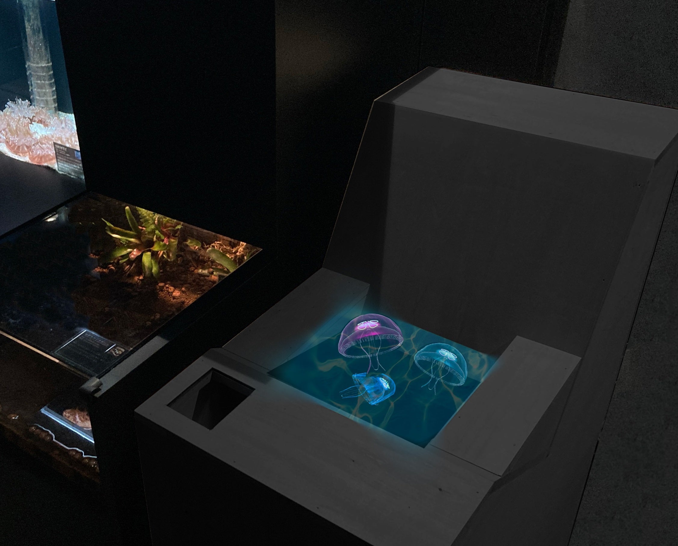 今回設置するバーチャル水槽は、「さわれる水槽」をコンセプトとしており、AFIDで空中に投影された生きものの映像を、来館されたお客様自身で触れるような不思議な体験をすることができます。