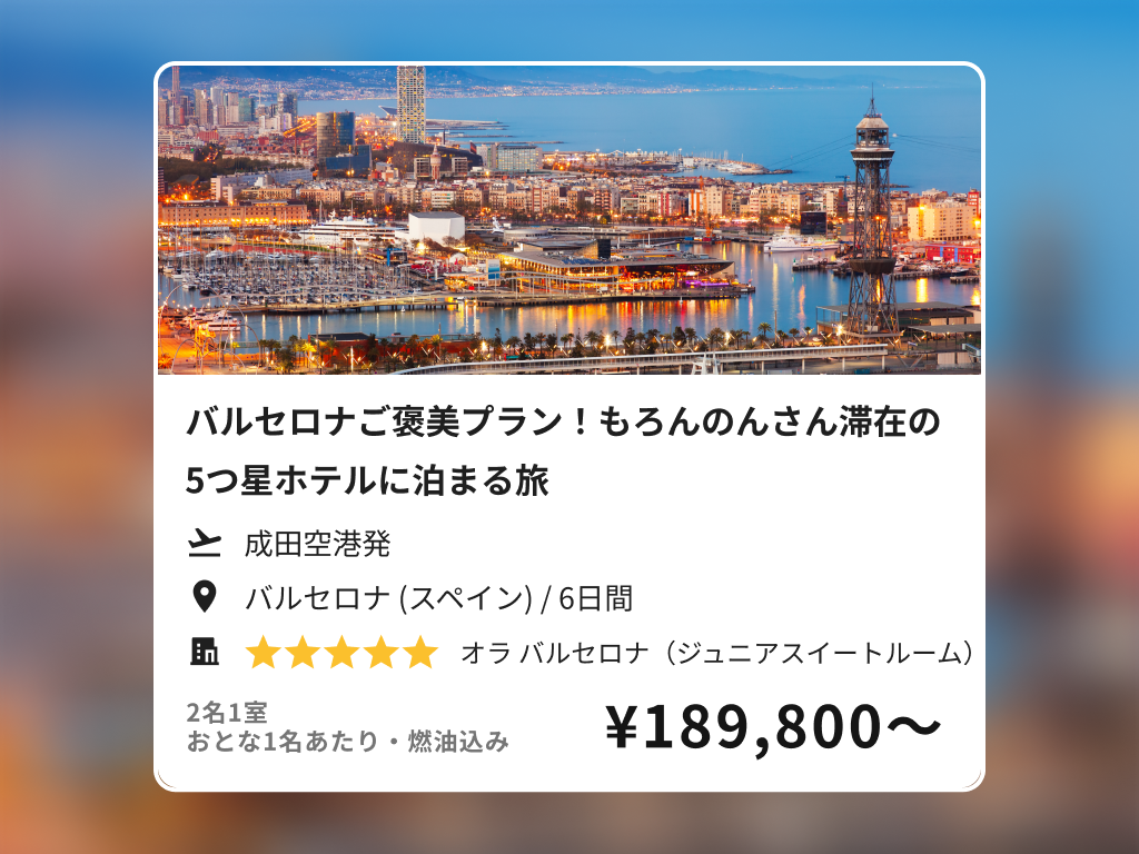 今回のコラボ企画でもろんのんさんにご利用いただいた航空会社、ホテルと同様のツアーを体験できる、おトクなバルセロナツアーをご紹介します。