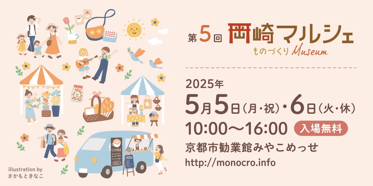 京都市勧業館みやこめっせでは、手づくり雑貨やフードが集まるマルシェイベント「第5回 岡崎マルシェ~ものづくりMuseum~」を、2025年5月5日(月・祝)~6日(火・休)に開催いたします。