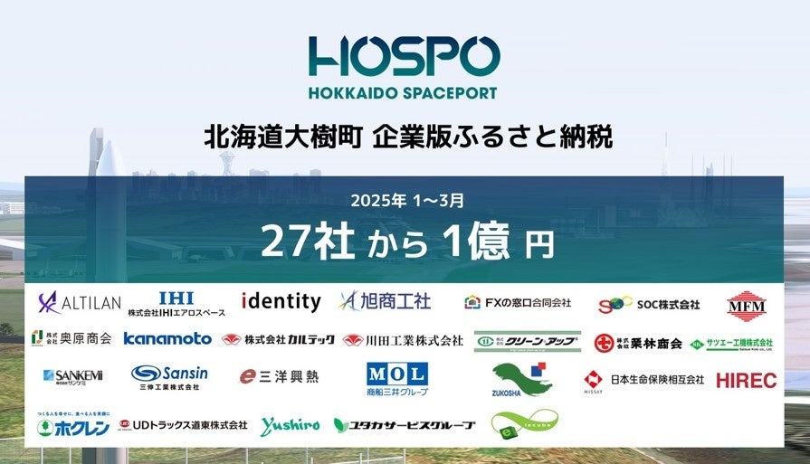 北海道大樹町(町長:黒川豊)とSPACE COTAN株式会社(本社:北海道広尾郡大樹町、代表取締役社長兼CEO:小田切義憲)は、民間にひらかれた商業宇宙港「北海道スペースポート(HOSPO)」プロジェクトの資金として、2025年1月から3月までの間に、北海道内外の27社から企業版ふるさと納税で合計1億540万円の寄附をいただきました。