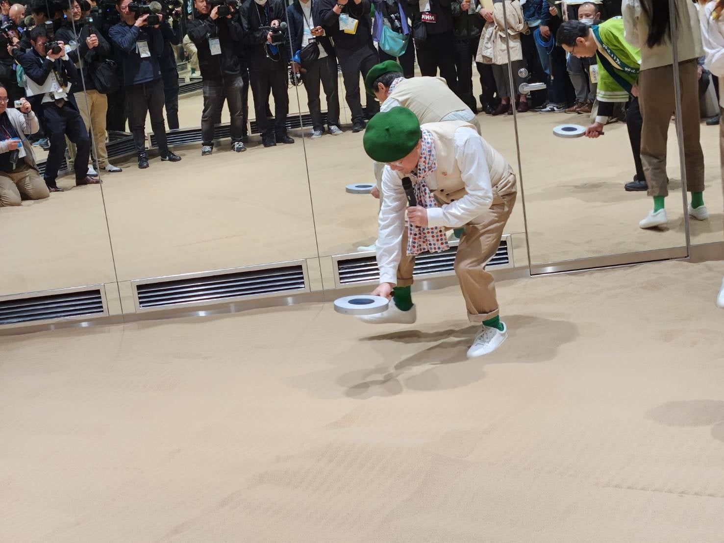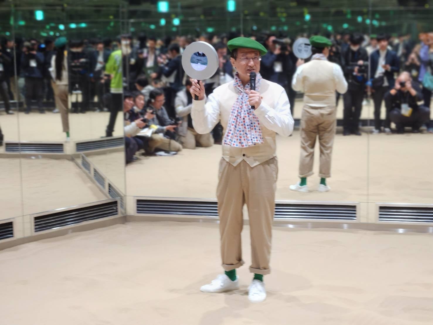 鳥取県ゾーンのアテンダント・スタッフユニホームに身を包んだ平井鳥取県知事と、鳥取県観光連盟小谷文夫会長が「関西パビリオン」の鳥取県ゾーンのエントランスに登場。「鳥取県ゾーン初お披露目です!」の掛け声で除幕が行われると「名探偵コナン」の「江戸川 コナン」、「遥かな町へ」の「中原 博史」、「ゲゲゲの鬼太郎」の「鬼太郎」の立体オブジェクトが姿を現しました。続いて平井鳥取県知事は、鳥取砂丘の砂を敷き詰め、周りを鏡で囲った鳥取県ゾーンのメイン展示「鳥取無限砂丘」で「虫眼鏡型デバイス」を使った体験企画に挑戦。砂丘のなかから、3月30日に開館する鳥取県立美術館や、二十世紀梨や松葉がに、弓浜絣(ゆみはまがすり)などの観光・グルメ・工芸などの鳥取県の魅力アイテムを発見した知事は無事「とっとり魅力名探偵認定証」をゲット。「名探偵コナンになったようで、大人も子どもも夢中になって、次々と発見していくのが楽しい」とコメントし、鳥取県ゾーンの魅力を発信しました。