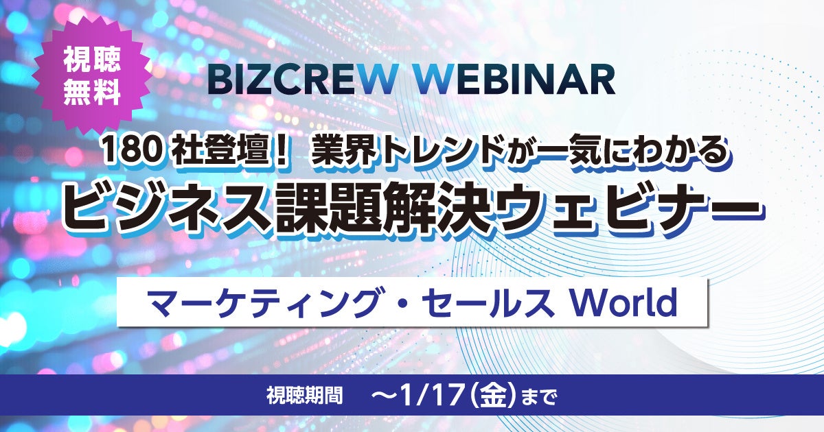 1月29日(水)〜31日(金)東京ビッグサイトにて開催される「マーケティング・セールス World」に先駆け、マーケティング・営業部門の業務課題解決のヒントとなる最新トレンドを学べる展示会出展企業によるオンラインセミナーを、1月6日(月)〜17日(金)の期間限定で配信いたします。