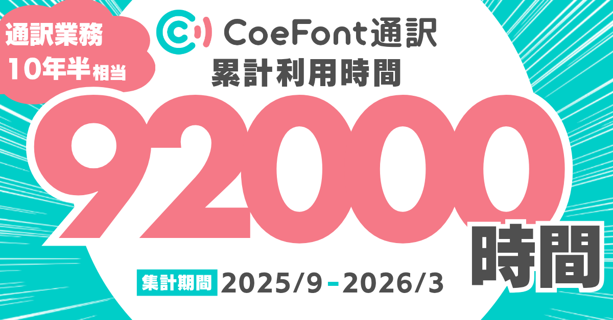 株式会社CoeFont(本社:東京都港区、代表取締役CEO:早川尚吾)は、AIリアルタイム翻訳ツール「CoeFont通訳」の提供開始から半年間(2025年9月〜2026年3月)の利用実績を公開いたします。