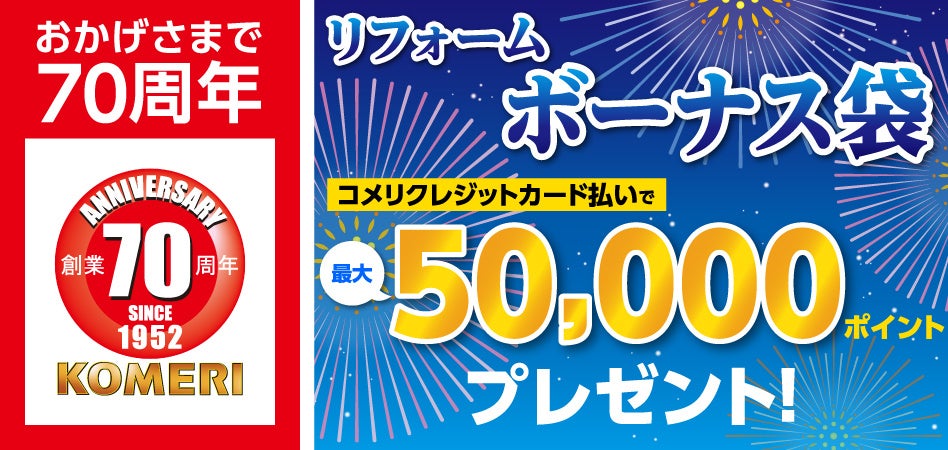 ホームセンターの「コメリパワー」や「コメリハード&グリーン」を通し地域のライフラインとして、地元のプロを応援する株式会社コメリ(所在地:新潟県 新潟市、代表取締役社長:捧雄一郎)は、お得なリフォームボーナス袋の受付を6月1日(水)より、「コメリパワー」「コメリハード&グリーン」店舗、オンラインショッピングサイト「コメリドットコム」にて開始します。