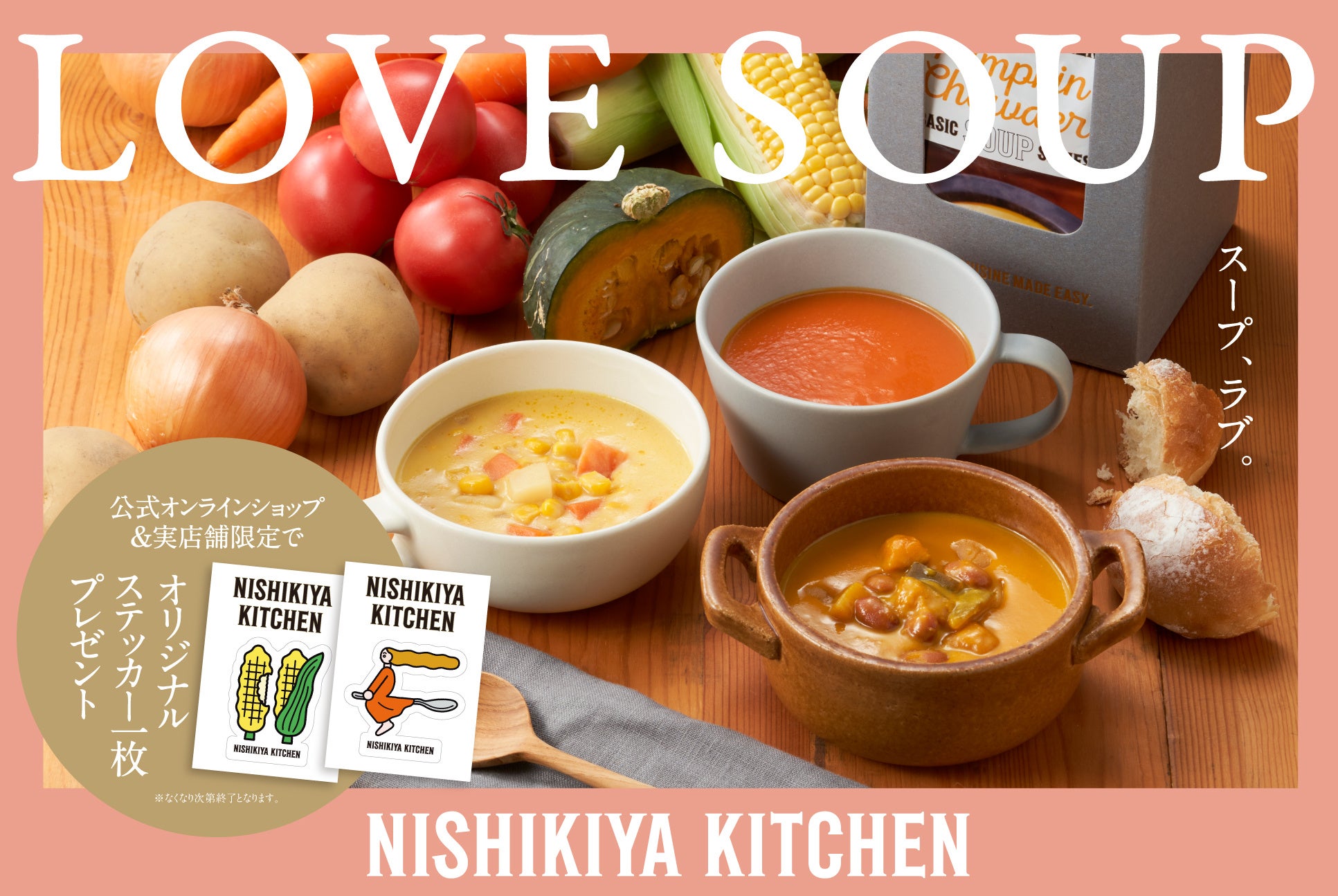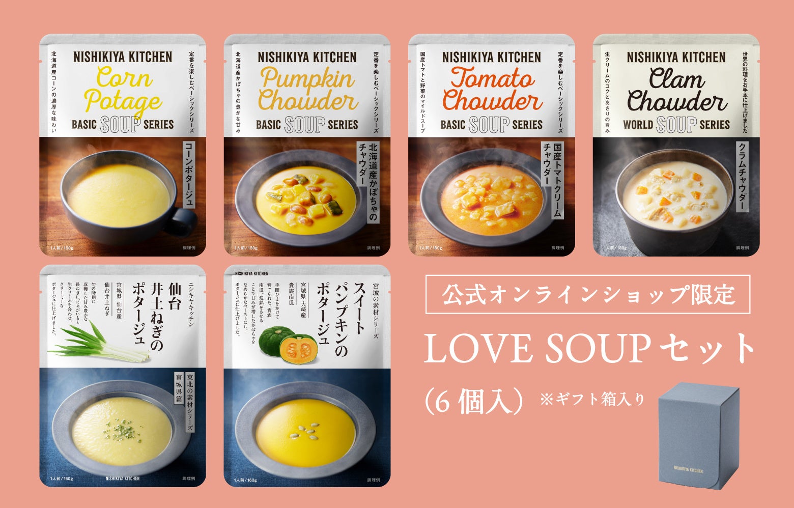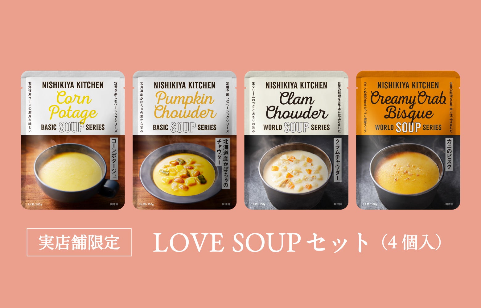 公式オンラインショップと実店舗では、ニシキヤキッチンの人気スープをつめ合わせた「LOVEスープセット」を販売します。素材にこだわった、心も体も温まるスープが勢揃いのラインナップです。