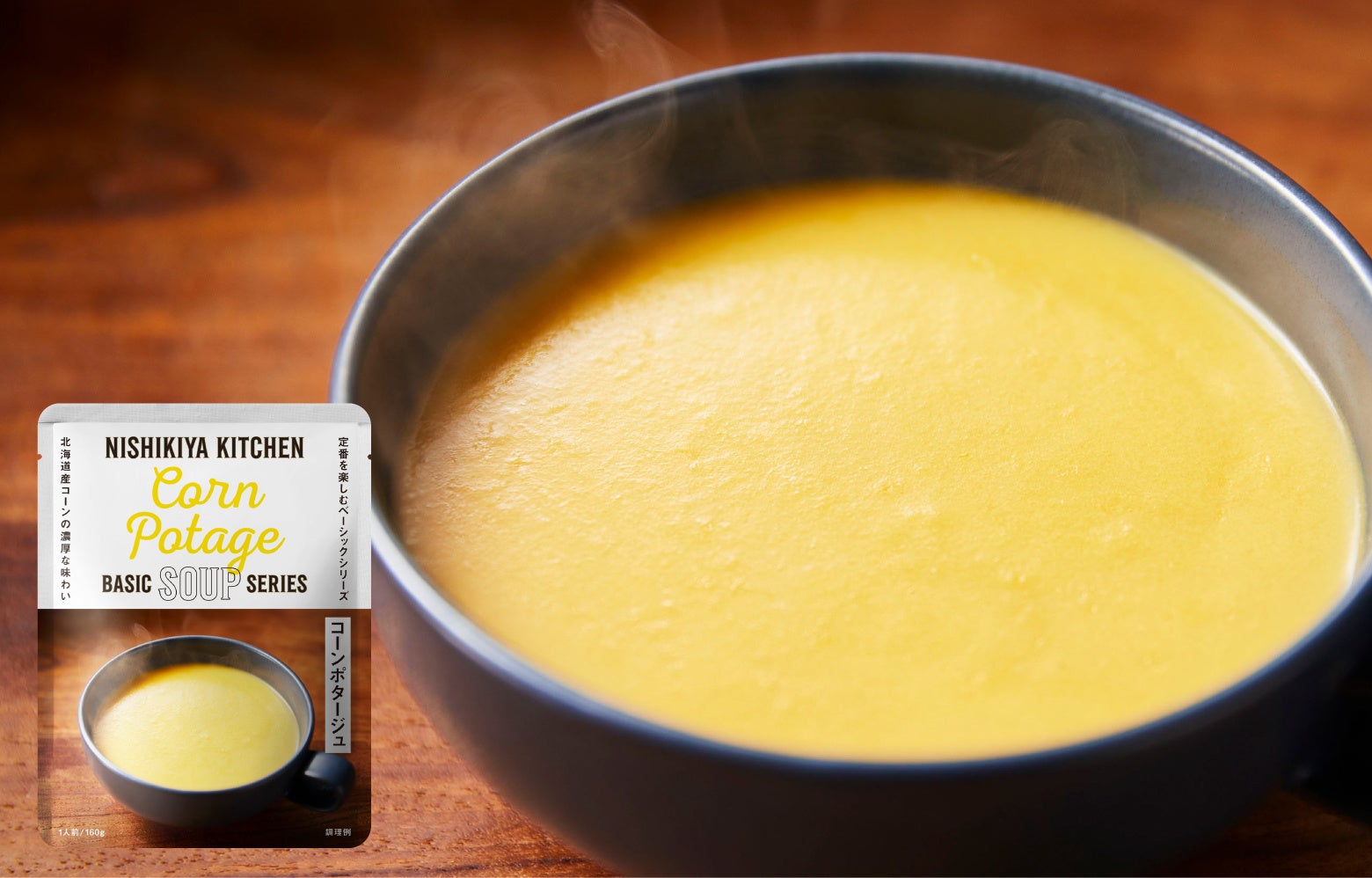 北海道産コーンペーストをたっぷりと使った濃厚スープです。コーンの素材のおいしさを最大限に生かすために、小麦粉、クリーム、バターは使用していません。上品で口当たりのよい、素材そのものの甘みをお楽しみいただけます。