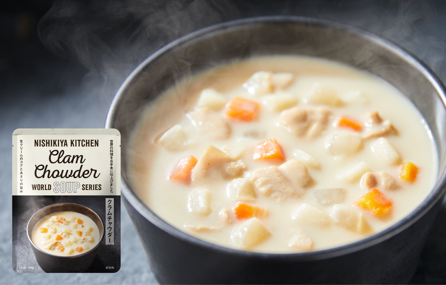 アメリカのクラムチャウダーをお手本にしました。生クリームのコクと魚介の旨みが凝縮したスープに、白ワインやローレルを合わせ、味わい深く仕上げました。