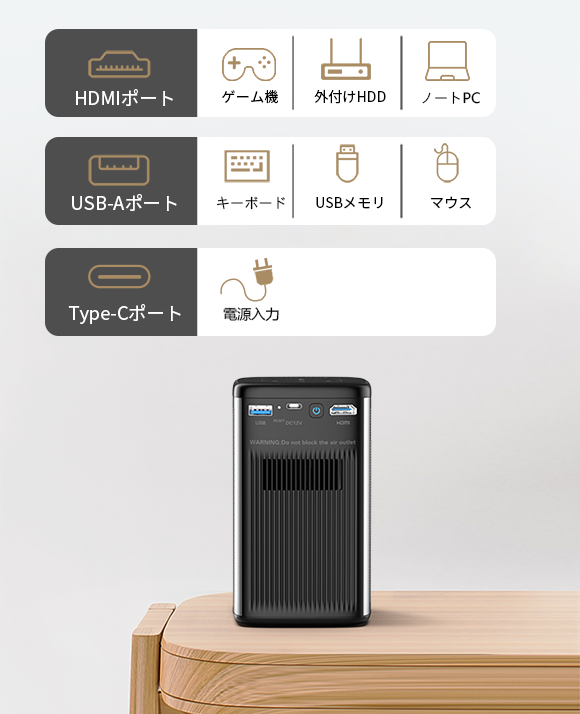対応機器:スマートフォン/MacBook/ノートパソコン/iPad/Miracast/ USBメモリー/TVボックス/PS3などゲーム機またはWi-Fiと様々なのデバイスに接続できます。