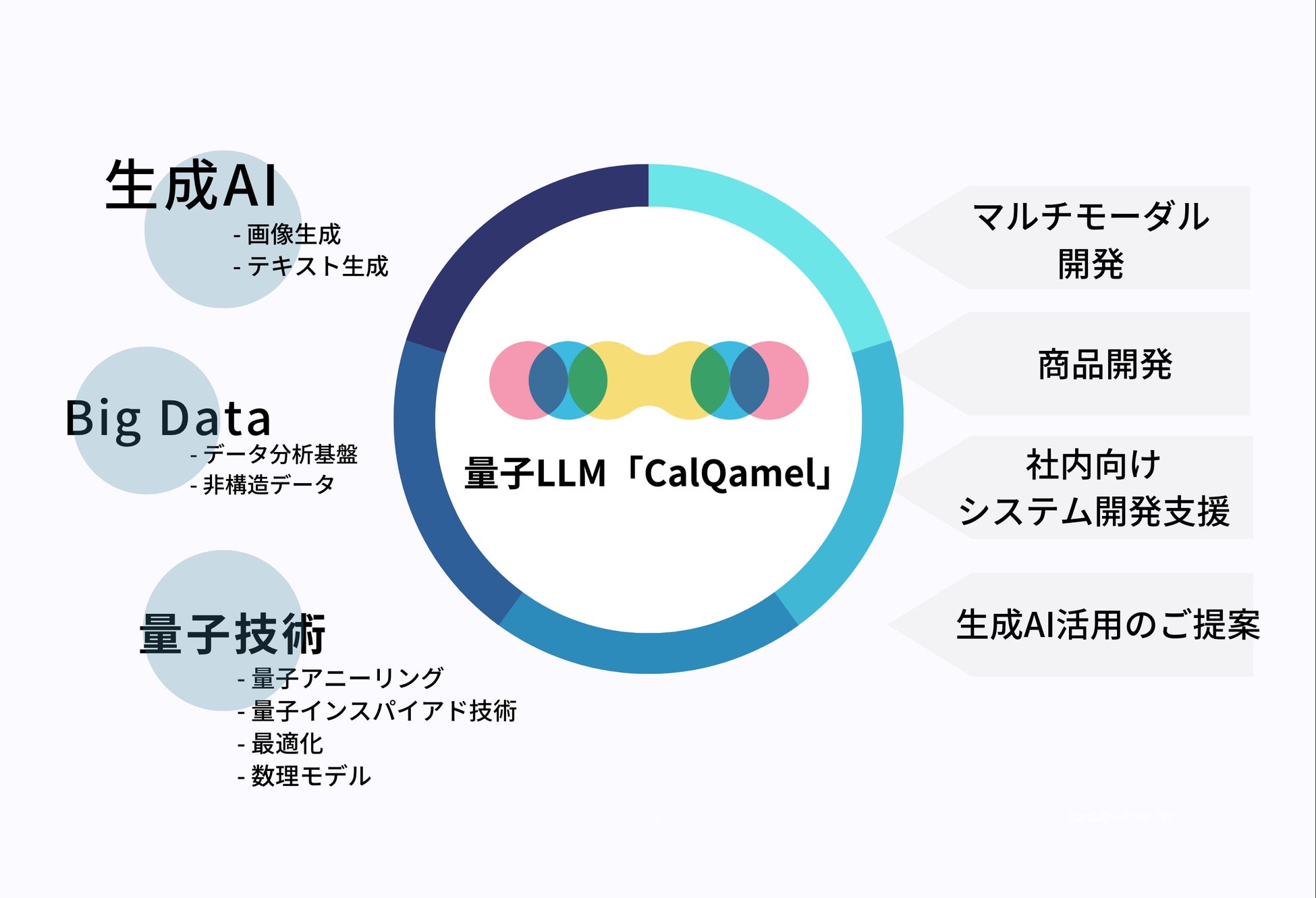 KandaQuantumはこの度「量子LLM」CalQamelの開発を手がけます。その目的は日本のAI技術を世界レベルに引き上げ、新たな産業創出の土壌を作ることです。AI技術と量子コンピュータ技術の融合により、新しいAIサービスの提供が可能となります。