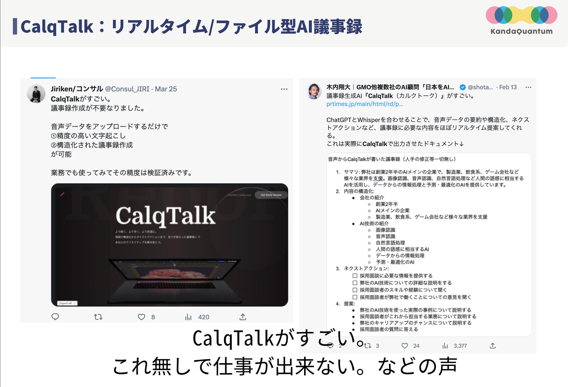 CalqTalk: アップロードされた音声ファイルからリアルタイムに議事録をAIが作成します。