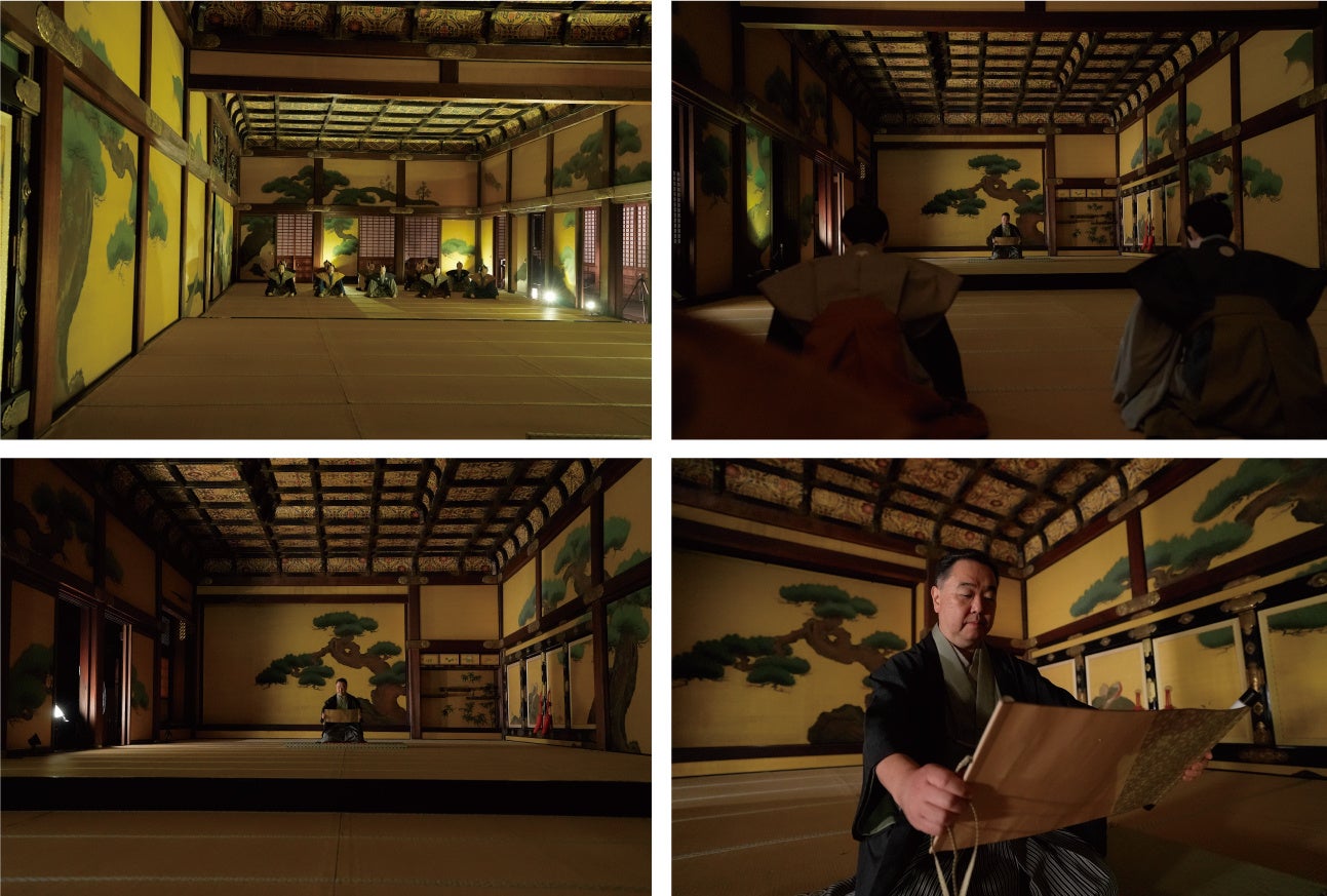 1867年(慶応3年)に15代将軍 德川慶喜により大政奉還が表明された世界遺産「二条城」で、德川宗家の当主が公式に着席する様子を撮影しています。本映像は、歴史的に非常に貴重なものとなりました。