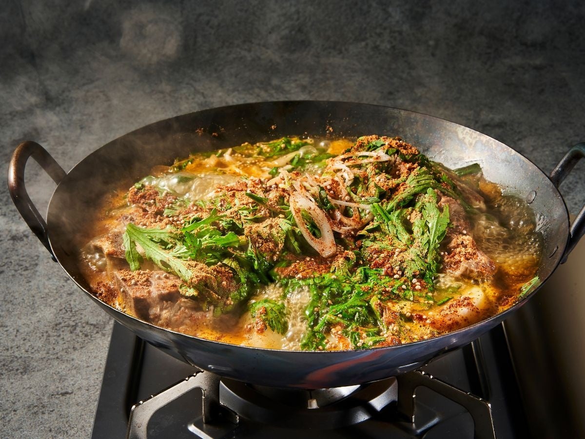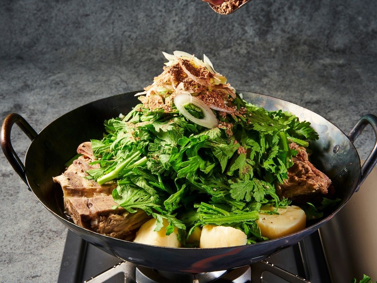韓国料理の代表格「カムジャタン」。豚の背骨をじっくり煮込み、ピリ辛スープとホクホクのじゃがいもが絶妙に絡み合う逸品です。まさに“旨辛で沁みる”一品!!