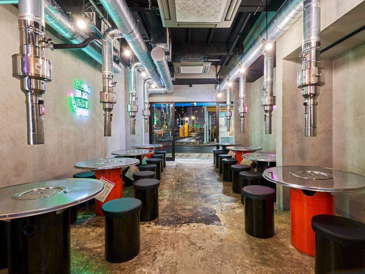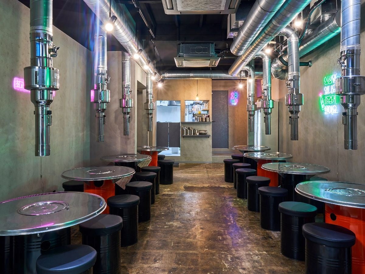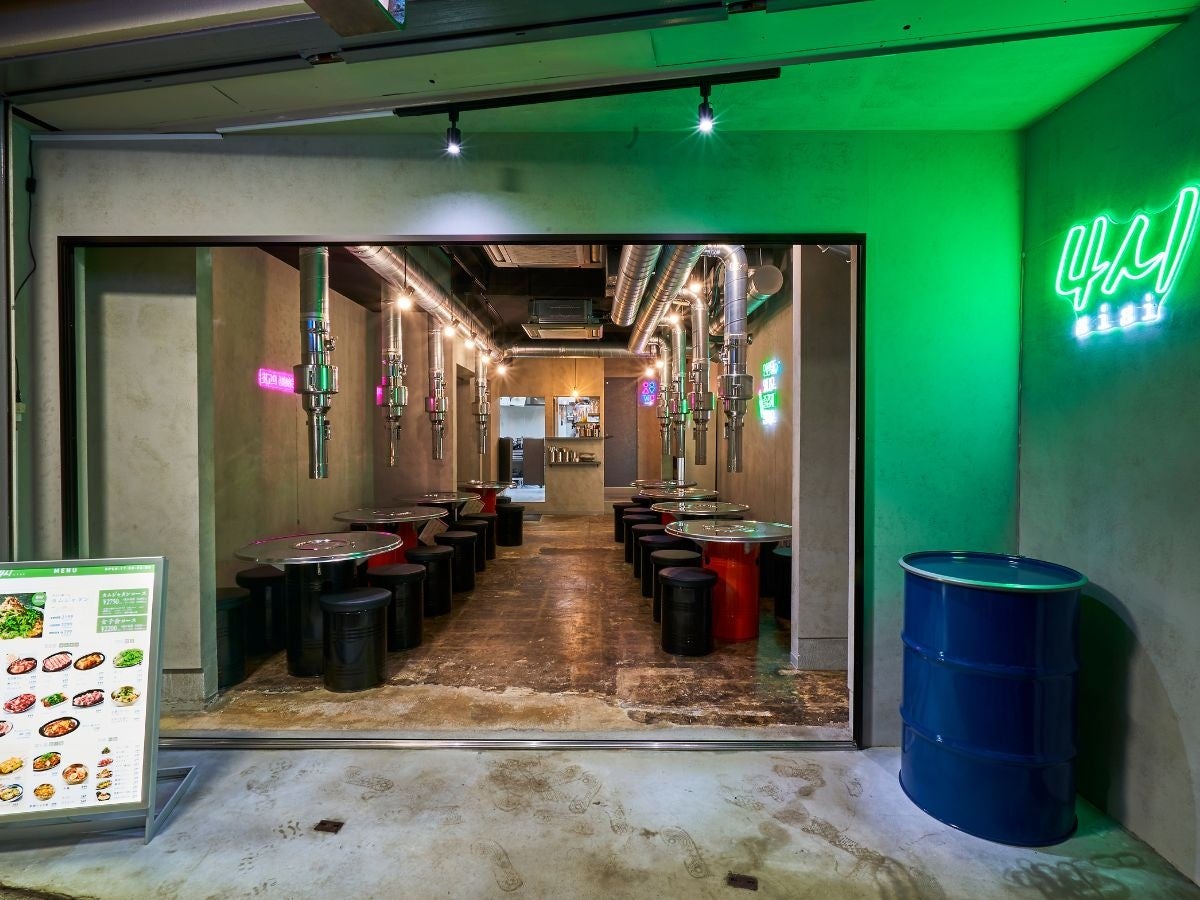 ネオンに照らされた韓国直輸入のテーブル、K-POPが流れる空間、立ち飲みスペースまで完備し、まるでソウル・弘大(ホンデ)の焼肉店に迷い込んだような気分に。