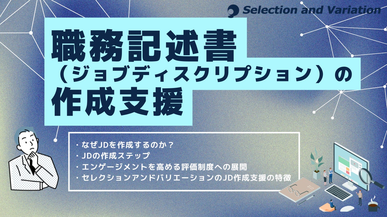 組織・人事コンサルティングファームであるセレクションアンドバリエーション株式会社(以下、当社、東京都千代田区丸の内、大阪市西区、名古屋市西区 / 代表取締役社長:平康慶浩/ URL:https://sele-vari.co.jp/)は「職務記述書(ジョブディスクリプション)の作成支援」サービスのご提供をご案内致します。