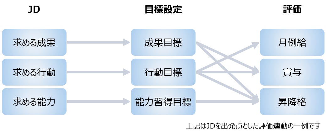 JDで方向付けを行った後は、そこに向けて努力し、結果を出した個人を会社として評価し、報いていくことが肝心です。評価制度と連動することで個人のモチベーション向上につながり、会社の成長や満足感の高いキャリア形成に繋がっていきます。