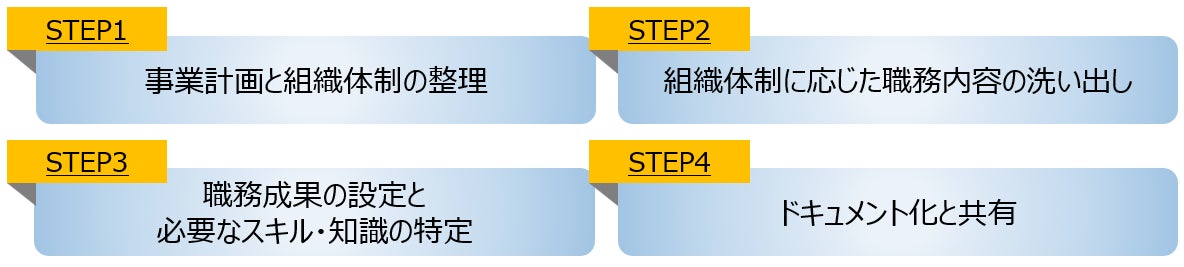 自社にとって有効なJDを作成するためには、適切なステップを踏むことが不可欠です。自社の目指す方向や事業計画を踏まえながら、“どのような業務がある・必要なのか?”、“その業務にどのような成果・行動・能力を求めるのか?“を適切に定義していくことが重要です。