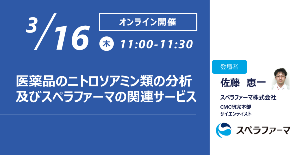スペラファーマ株式会社(本社:大阪府大阪市、代表取締役社長:岩城 慶太郎)は、2023年3月16日(木)、「医薬品のニトロソアミン類の分析及びスペラファーマの関連サービス」について無料ウェビナーを開催いたしました。