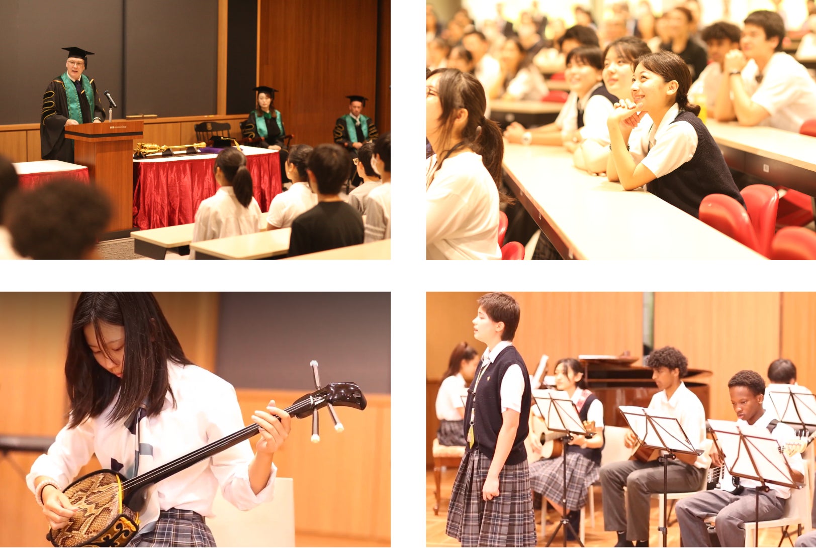 修了式後には30分間に渡る音楽演奏発表会が行われ、生徒はこの日までの練習の成果を存分に発揮しました。芸術教科の音楽選択生による『Amazing Grace』の演奏では、ボーカル、ピアノ、ギター、ベース、オーボエ、クラリネット、トランペットなどの個性溢れる楽器によって一体感のある表現豊かな音楽が奏でられ、1年間の学習の集大成となりました。その後、エンゲージ・プログラム(放課後活動)で音楽を選んだ生徒による様々な演奏が披露されました。オーボエとフルートによる二重奏、ピアノ連弾によるクラシック音楽、ロックバンドによる現代的な音楽、沖縄の伝統楽器である三線とボーカルによる『島人ぬ宝』、ギター伴奏による洋楽の合唱など、時代やジャンル、国境、言語の枠を超えた生き生きとした演奏が続き、多様性溢れる国際高等学校らしい発表に会場からは盛大な拍手が贈られました。