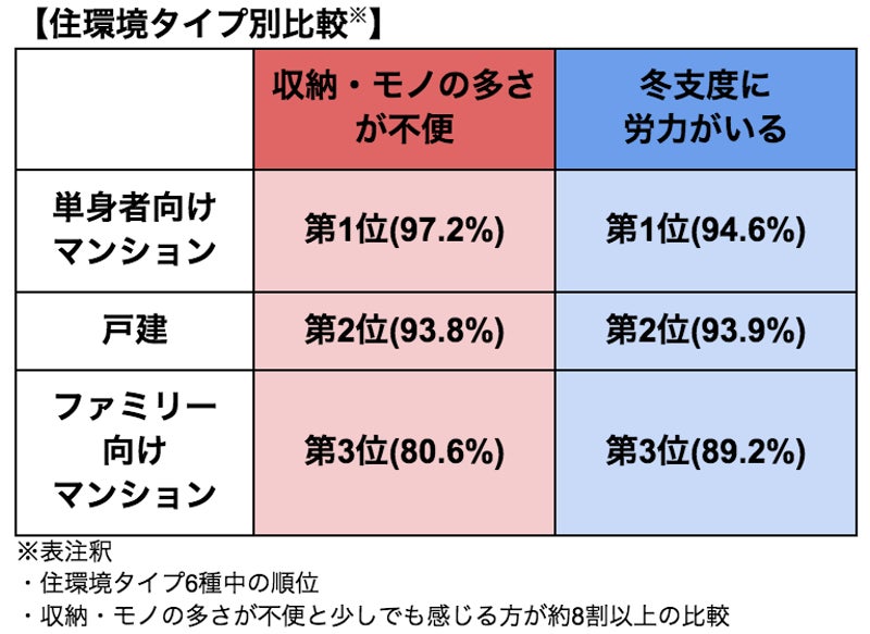また、関東の住環境タイプ別(戸建・マンション・アパート等)に見ていくと、単身者向けマンション(94.6%)・戸建(93.9%)で冬の準備は労力がいると少しでも感じる方が多い傾向でした。