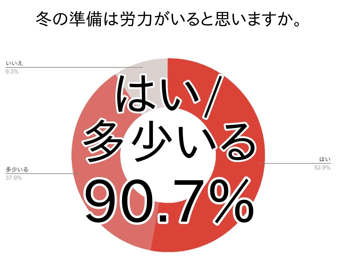 アンケートでは、冬の準備は労力がいる/多少いると答えた方は約9割(関東90.7%・全国88.0%)でした。