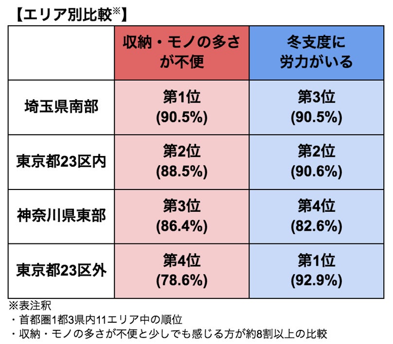なお、関東の地域別では、冬支度をすると収納スペースの使い勝手やモノの多さに不便を感じることがある方の割合は埼玉県南部(90.5%)・東京都23区内(88.5%)で高めでした。