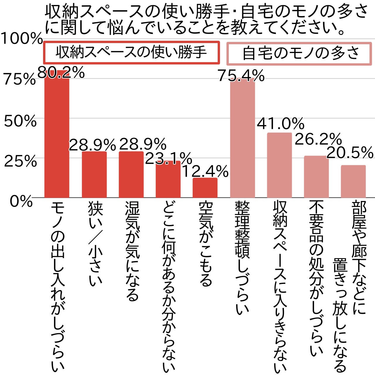 収納スペースの使い勝手や自宅のモノの多さに関して悩んでいることを尋ねました。
