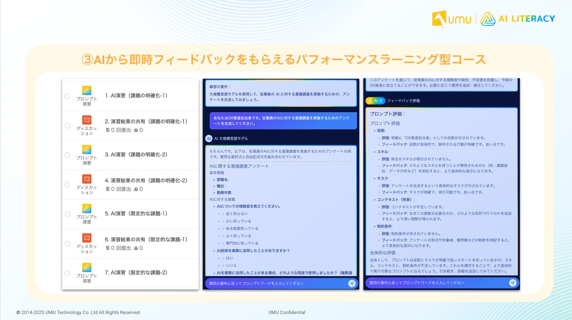 AIが受講者の入力したプロンプト(指示)をリアルタイムで解析し、即座にフィードバックを提供。これにより、学習効果を最大限に高め、スキルの定着を確実にします。