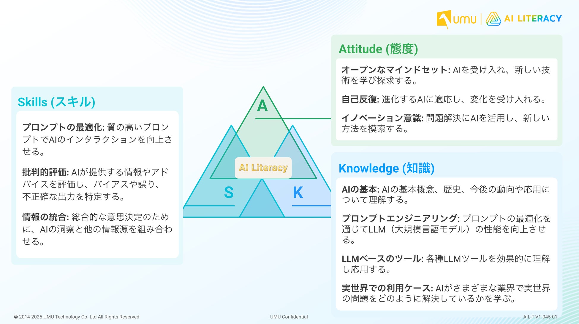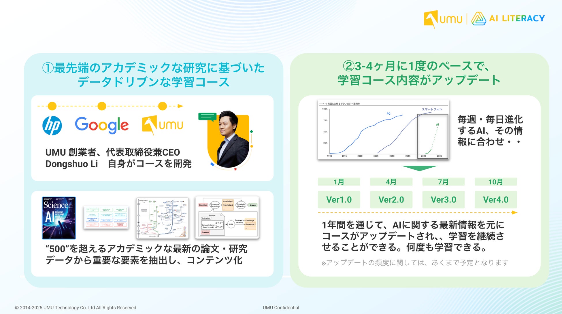 また、日本政府も「統合イノベーション戦略2024(※3)」に基づき、国としてAIリテラシーの向上を強力に推進しています。企業や個人が国際競争において優位に立つためにも、AIリテラシーの習得は避けられないテーマとなっています。そこでUMUは、AIリテラシーを身につけるためのオンライン講座をリリースし、AI活用の知識とスキルの普及に貢献しようと考えました。