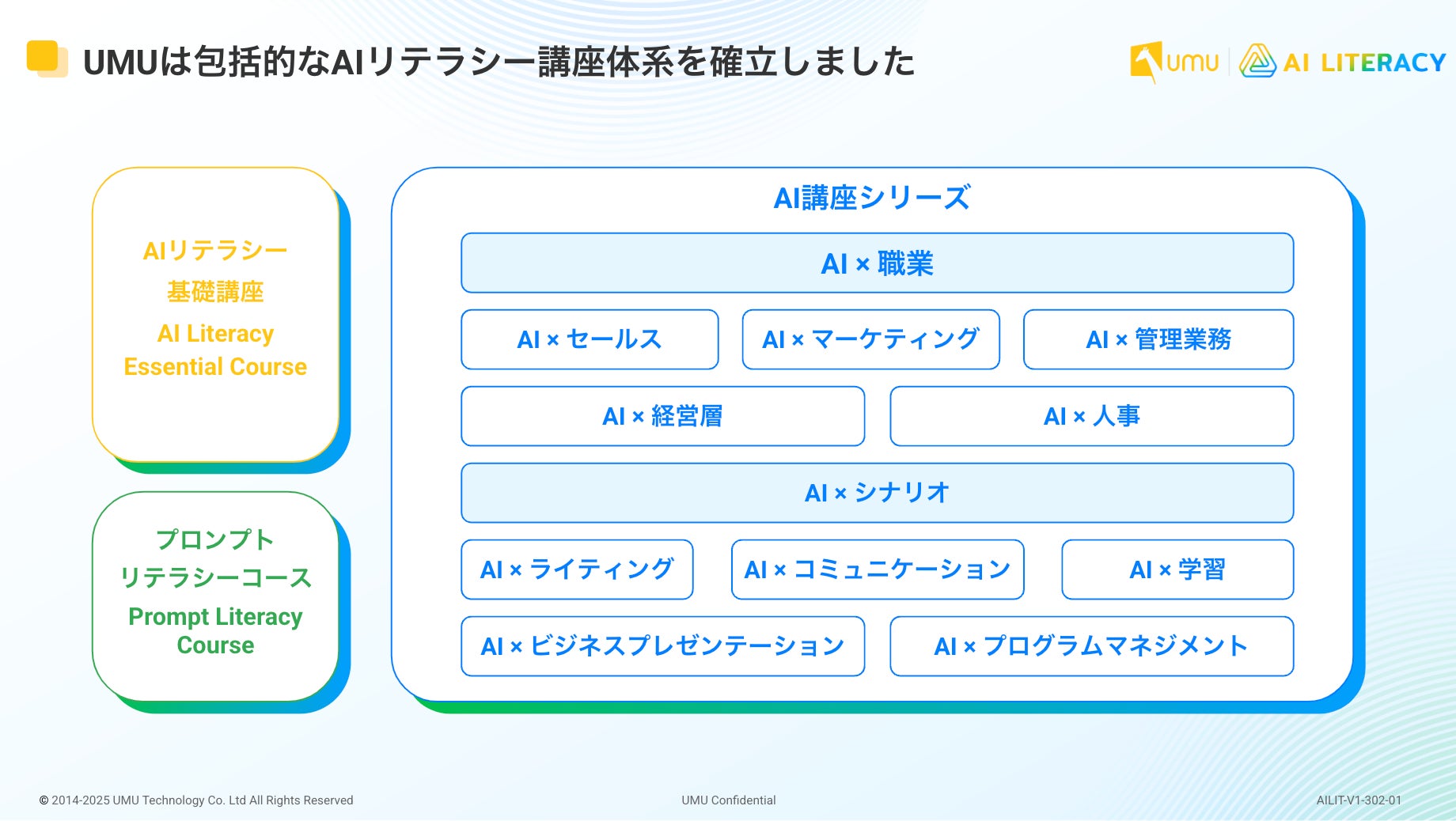 ユームテクノロジージャパン株式会社(本社:東京都新宿区、代表取締役:松田しゅう平、以下「UMU」)は、最新のAI技術と学習の科学に基づいた「AIリテラシーオンライン講座」をリリースしました。本講座は、急速に進化する大規模言語モデル(LLM)時代において、組織や個人がAIを活用して生産性を向上させ、業務効率を最大化するために必要なスキルを体系的に学べる、パフォーマンスラーニング型のコースです。特に生成AIの導入を検討中、または導入直後の企業においてAIの効果性を最大化する上で有効にお使い頂けます。