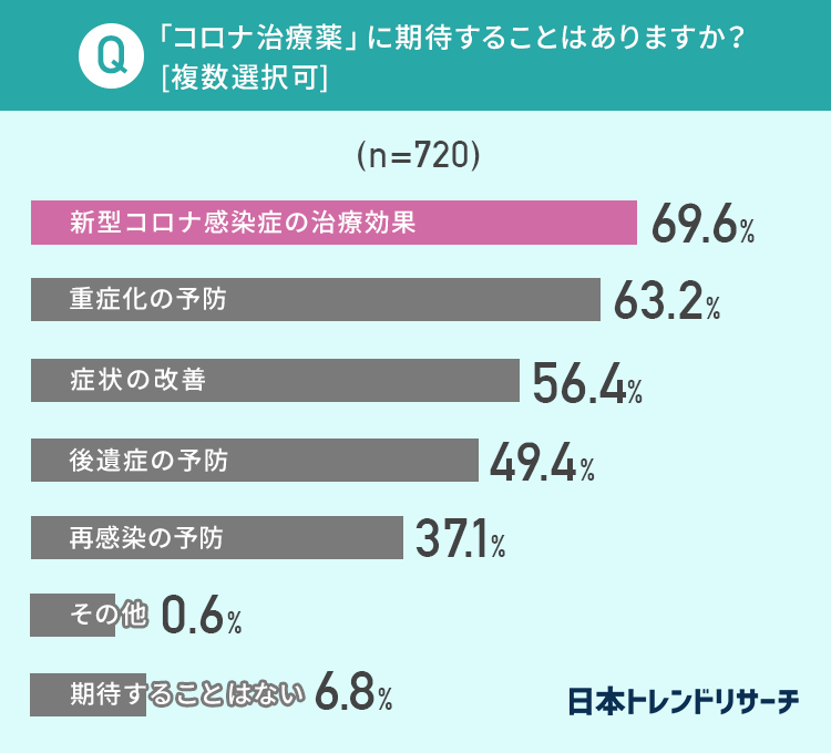 「コロナ治療薬」に期待することについては、「新型コロナ感染症への治療効果」「重症化の予防」といった即時的な効果に期待する方が6割を超えた一方、「期待することはない」と回答した方も6.8%いました。
