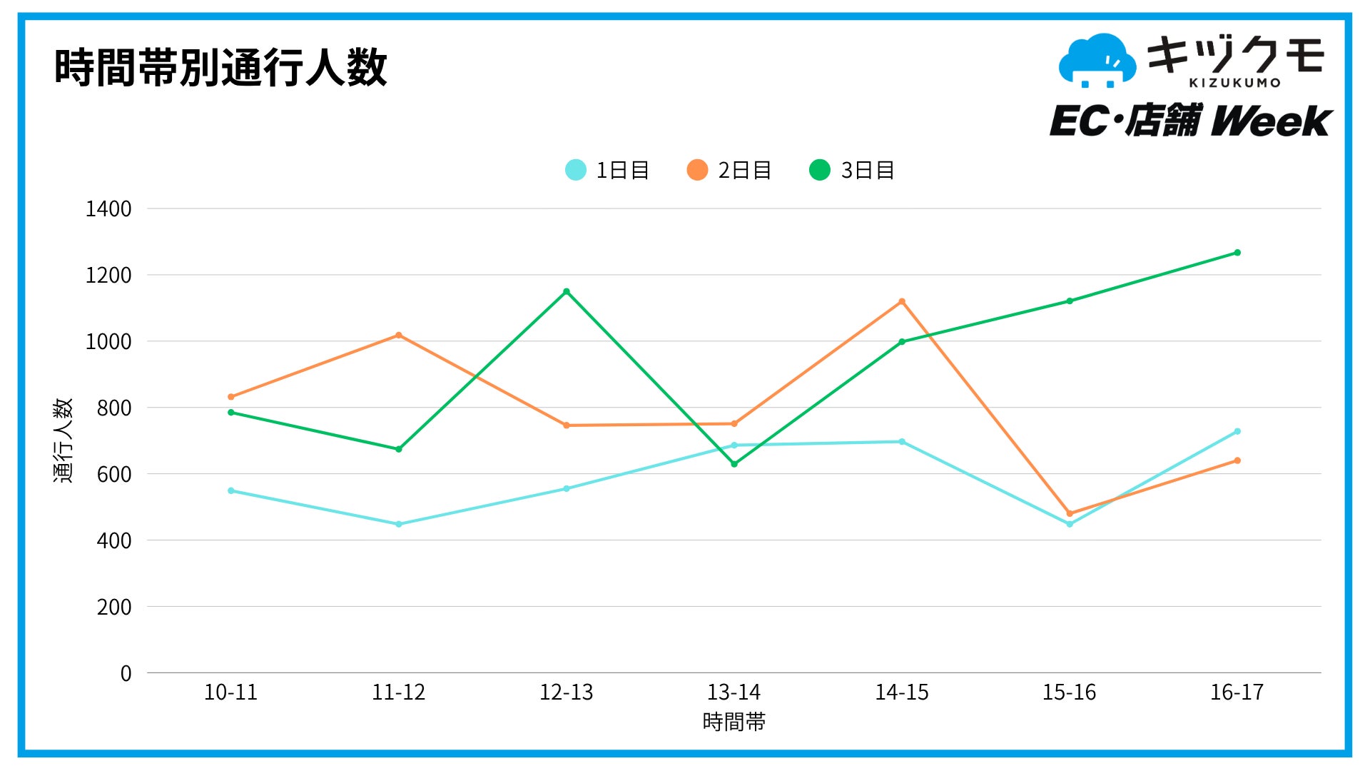 分析の結果、3日間を通じて14時から15時までの時間帯は、常に高い通行量を示す傾向がありました。このデータに基づき、ピーク時間帯に最適化したスタッフ配置を実施した結果、来場者の課題に対して迅速かつ密度の高い接客を実施することができました。