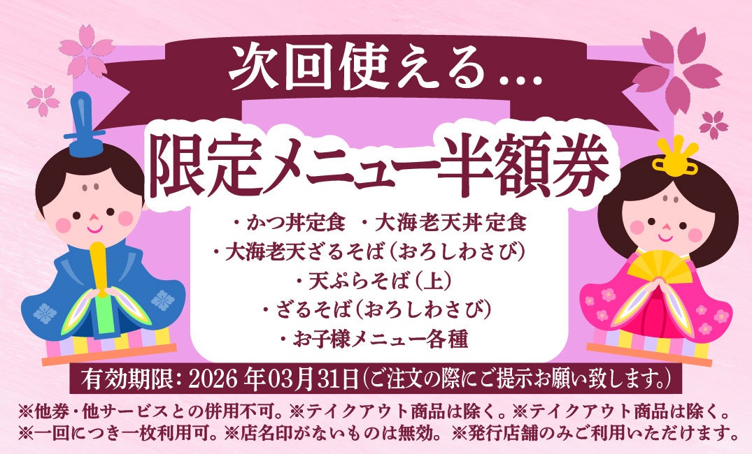 「限定メニュー半額お食事券」有効期限:2026年3月4日(水)~2026年3月31日(火)