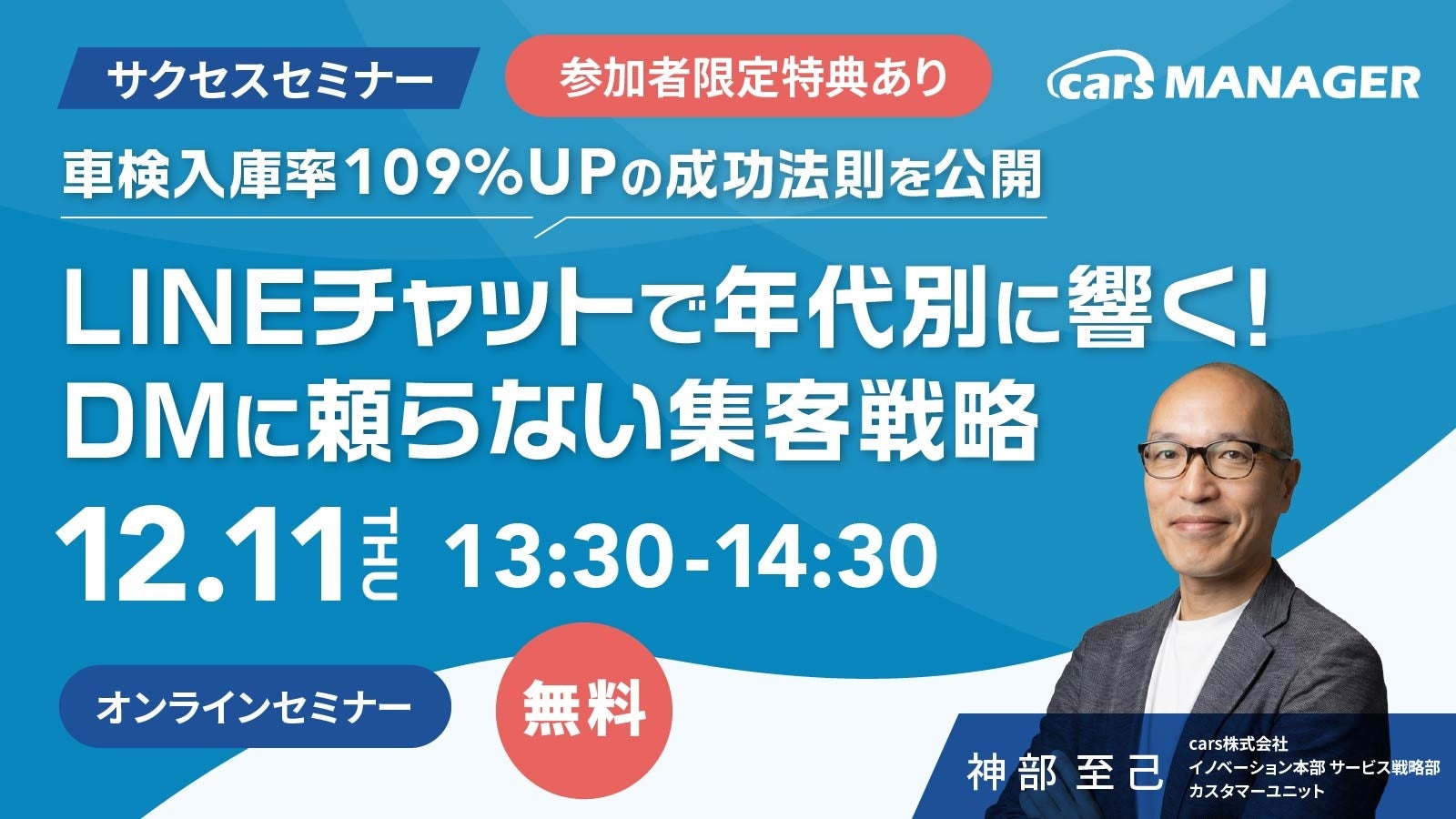 【12/11開催・carsサクセスセミナー】車検入庫率109%UPの成功法則を公開 - LINEチャットで年代別に響く!DMに頼らない集客戦略